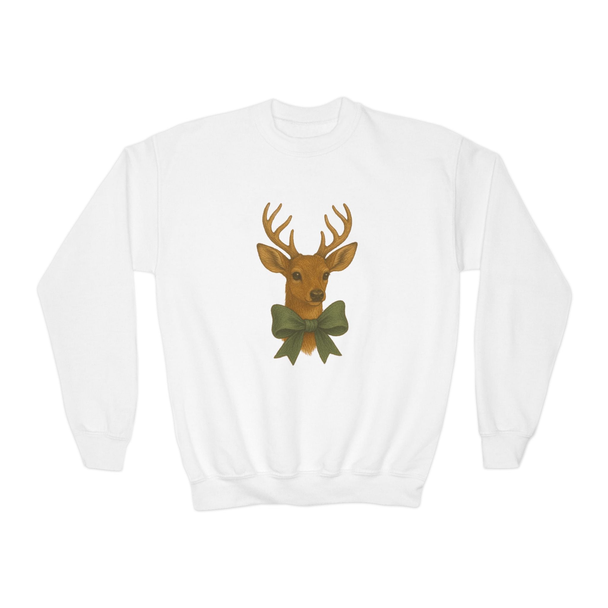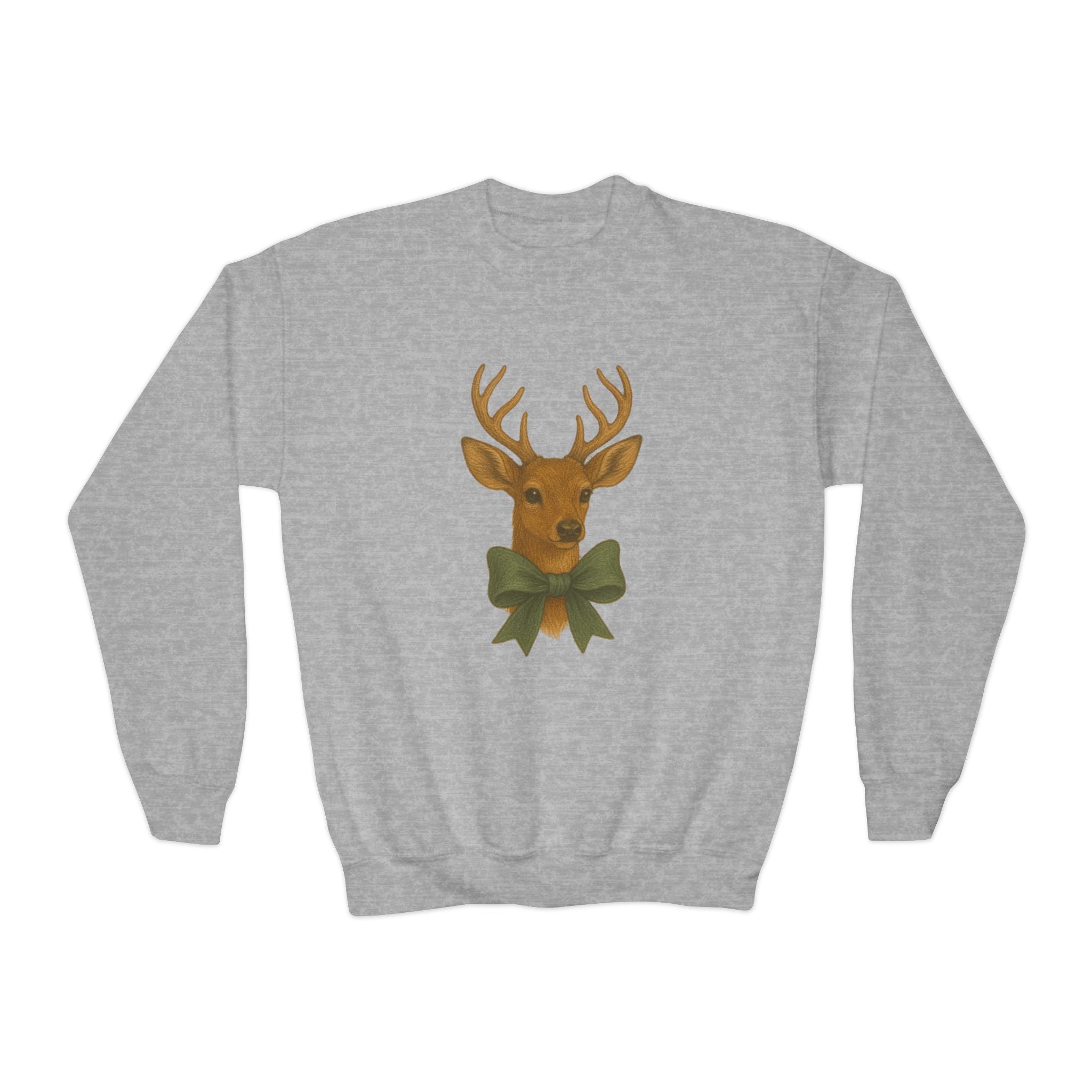 Elevate your child's wardrobe with this charming Youth Crewneck Sweatshirt. The delightful design features a whimsical deer adorned with a fancy bow, bringing a playful vibe to any outing. Perfect for layers in chilly weather, this sweatshirt ensures comfort and style, making it ideal for casual school days, family gatherings, or holiday celebrations. Its cozy, loose fit provides room for movement, allowing kids to play freely while looking adorable. This sweatshirt is a perfect gift for birthdays, Christmas, or any special occasion where a touch of whimsy is welcomed.